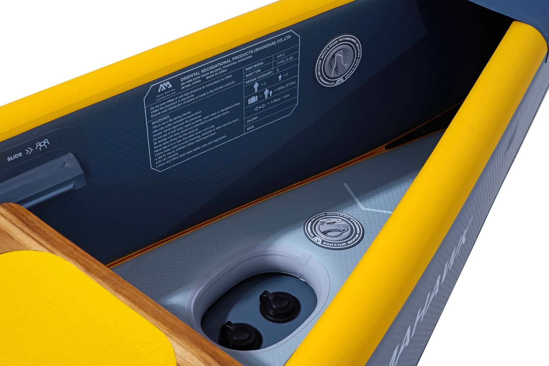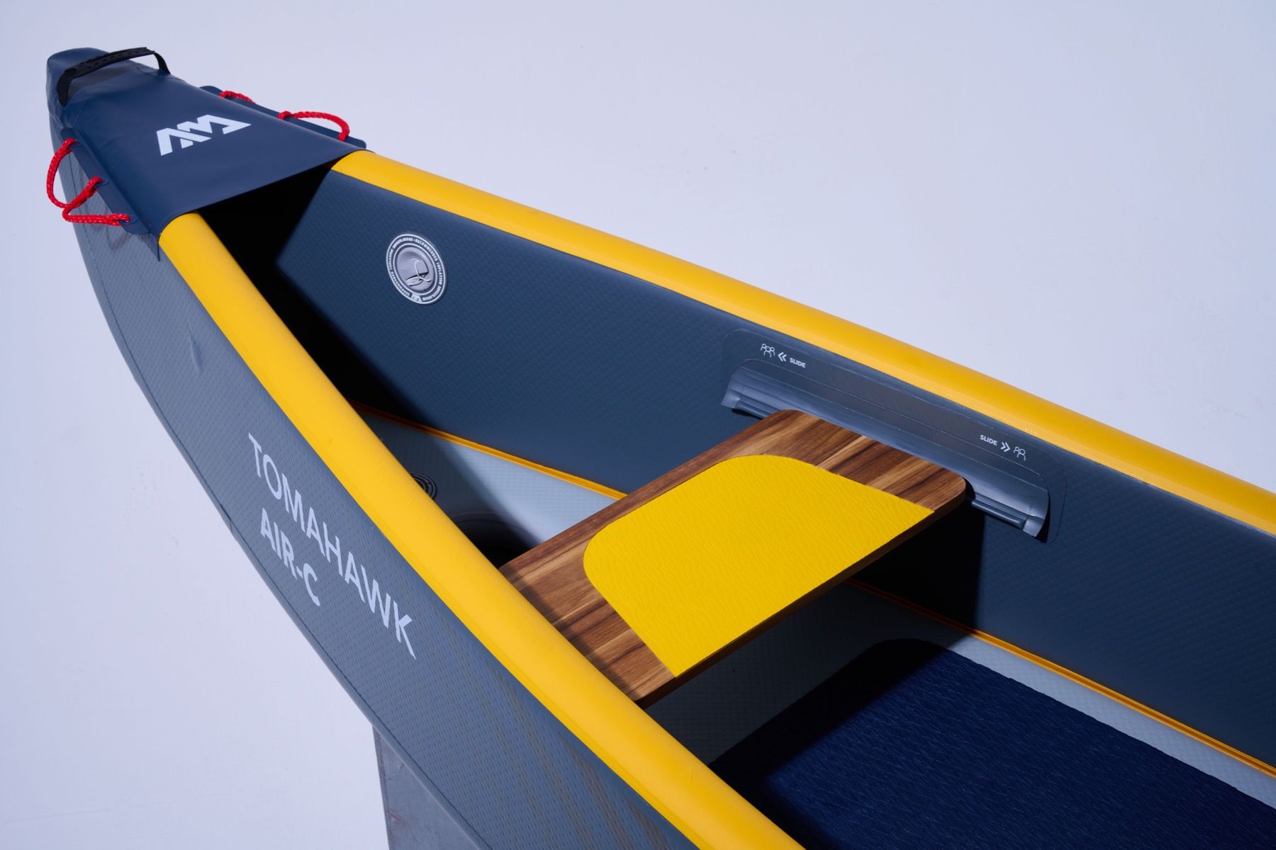 O Tomahawk AIR-C é 40% mais leve do que uma canoa rígida clássica, sem comprometer o seu desempenho. Graças à sua longa linha de flutuação, quilhas moldadas e tecnologia avançada de costuras suspensas, oferece uma rigidez e estabilidade excecionais, garantindo uma experiência ótima tanto em águas calmas como em condições mais difíceis. A sua grande capacidade de carga torna-o ideal para longas viagens, oferecendo um espaço generoso para passageiros e bagagem.